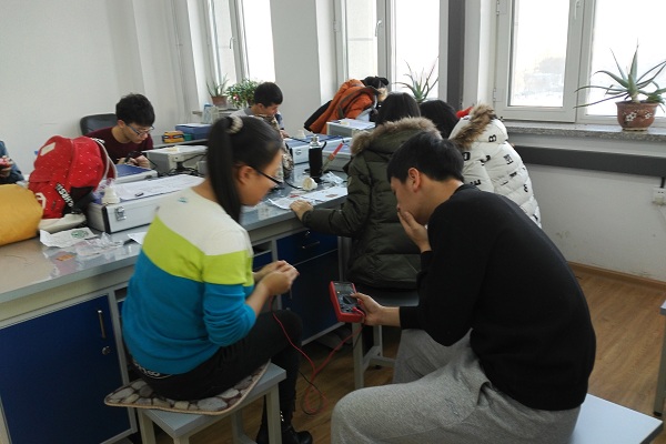 为积极探索课程改革的方法和手段,提高学生的动手能力和创新能力,2015年12月12日,电工学教研室在成栋楼504、508组织了一次别开生面的特殊授课。在宋其江、尹力 、刘大力、王立峰、李丹丹等几位老师的组织下,67名学生进行了声光两控延时灯头的电路焊接和安装。