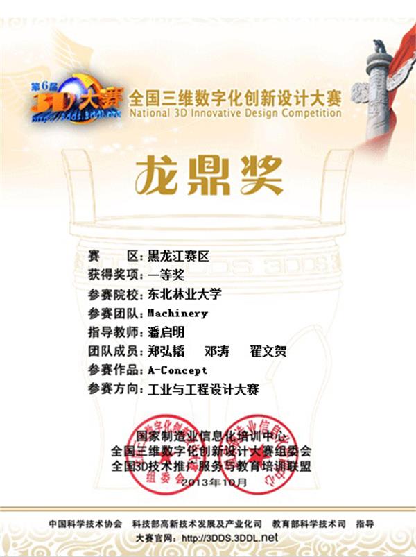 由国家科技部、教育部、中国科协等部门指导,科技部国家制造业信息化培训中心、全国3D技术推广服务与教育培训联盟、中国图学学会、光华设计发展基金会等单位共同主办的“黑龙江赛区2013全国三维数字化创新设计大赛”(3D大赛)落下帷幕。我院学生荣获一等奖1项,三等奖1项。