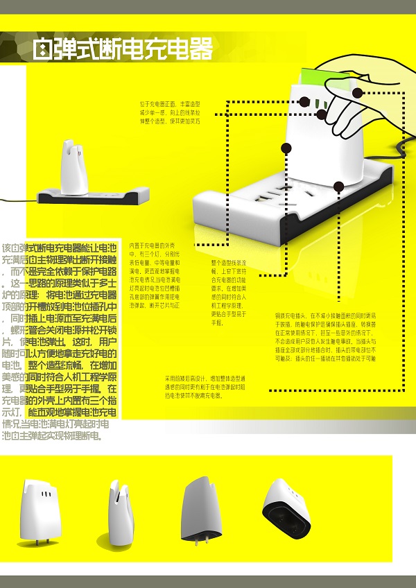 2014“市长杯”大连工业设计大赛获奖名单近日揭晓:我校机电工程学院工业设计专业龚潇潇同学设计的作品喜获大赛创意组三等奖。该同学设计的“模块化防绊排插”和“自弹式断电充电器”是一套极具人性化的组合充电产品,意在探索使用者在充电过程中更方便安全的使用方式。