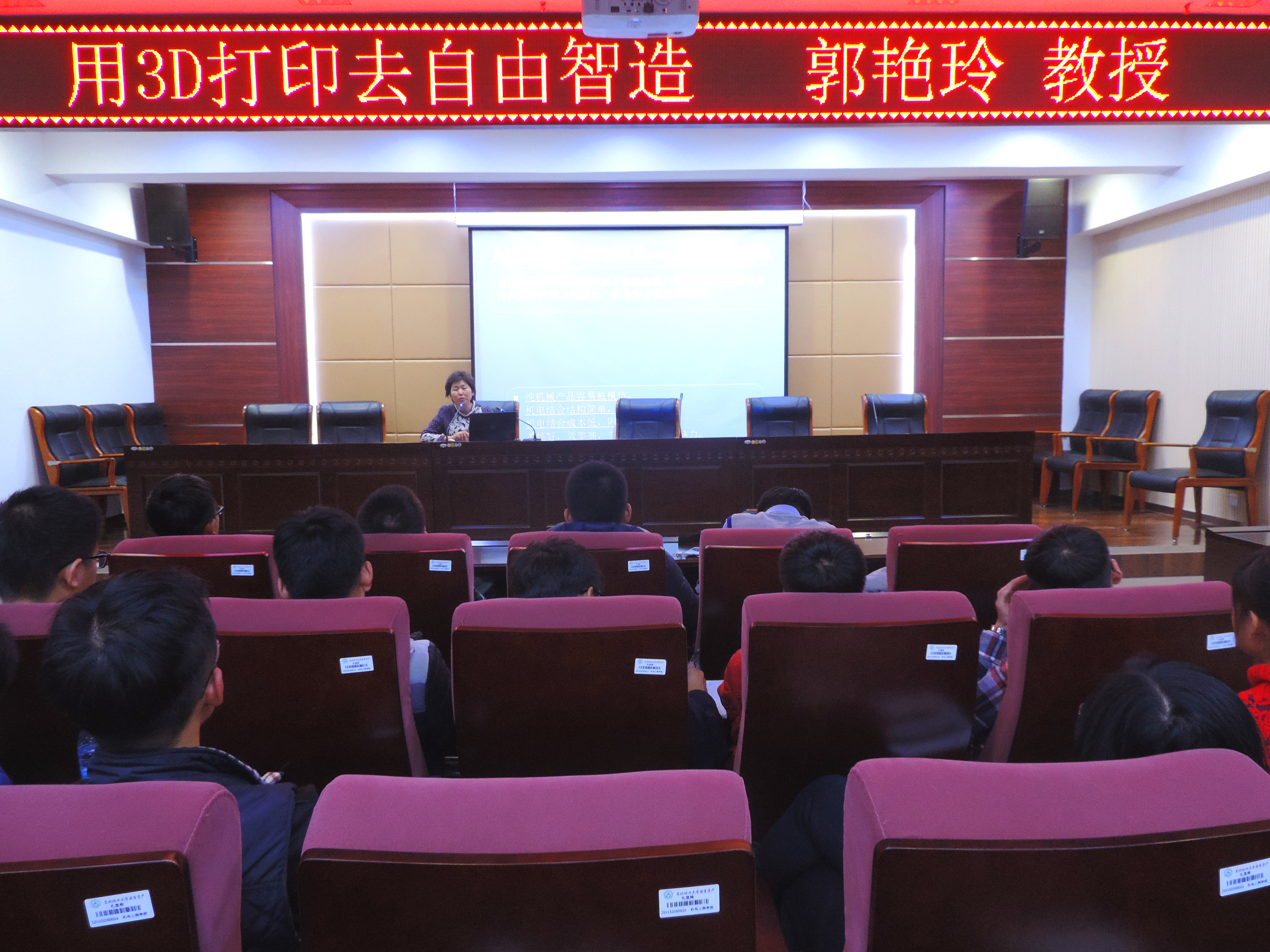2016年11月8日晚6点,机电工程学院博士生导师郭艳玲教授在成栋楼722给机电工程学院机械类的学生们进行关于用3D打印去自由智造的讲座。此次讲座旨在给学生们介绍3D打印技术以及分享郭艳玲教授的科研成果。
