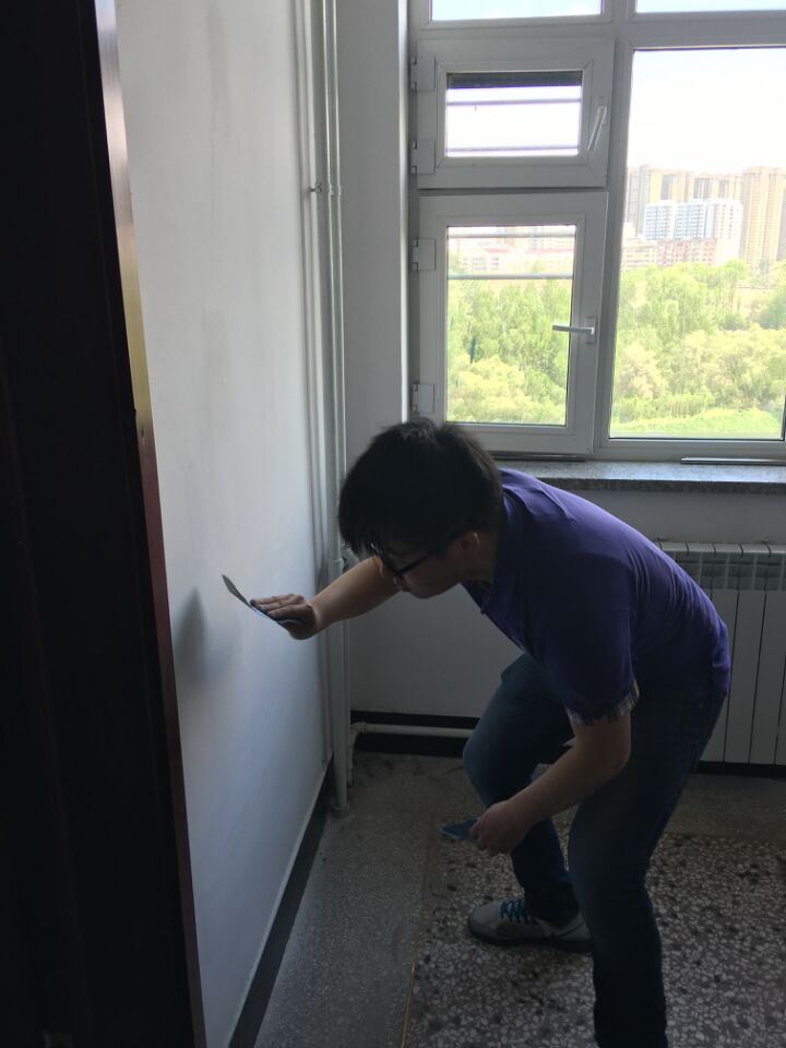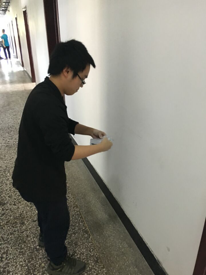 2016年5月25日中午,学生第五党支部学生党员按照楼层分组,开展学生宿舍14、15号楼的部分楼道墙壁清理工作。义务劳动持续一个多小时,楼道墙面焕然一新。学生党员表示:虽然身体劳累,但墙面干净了,自己的内心很充实、很快乐,希望广大同学们能够爱校护校,树立母校荣则己荣的主人翁意识,通过每个同学的努力使学校变得更加美好。