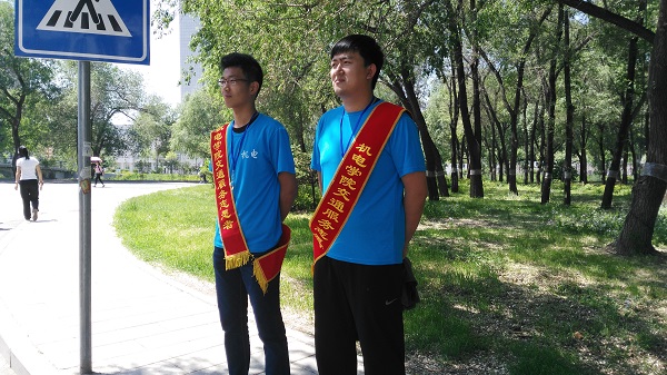 参加志愿服务的学生党员两两一队,共三队,每队负责不同的交通岗位,他们身穿蓝色T恤,每人配备一个口哨,并佩戴写有“机电工程学院交通志愿者”字样的绶带,志愿者们醒目的着装,精神的面貌成为同学们上学、放学路上一道亮丽的风景线,吸引了很多同学的注意,并得到了同学们的肯定。在值班站岗时,志愿者们需要顶着热辣的阳光,时刻注意来往的人群和车辆,以免发生拥挤、占道等现象,这对于志愿者们来说,不管是在体力还是在脑力上都是一项巨大的挑战。但他们经受住了考验,在30分钟的志愿服务里,他们全程兢兢业业,尽力引导着来往的人群,道路交通因他们的存在比平时更为整洁有序。