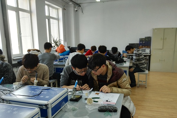 为积极探索课程改革的方法和手段,提高学生的动手能力和创新能力,2015年12月12日,电工学教研室在成栋楼504、508组织了一次别开生面的特殊授课。在宋其江、尹力 、刘大力、王立峰、李丹丹等几位老师的组织下,67名学生进行了声光两控延时灯头的电路焊接和安装。