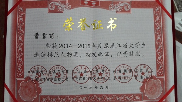 10月27日下午,2014-2015年度黑龙江省高校教师、大学生年度人物暨道德模范人物(群体)评选活动的颁奖典礼在东北农业大学音乐厅隆重举行。机电工程学院2012级学生曹雪甫获得黑龙江省大学生道德模范人物奖。