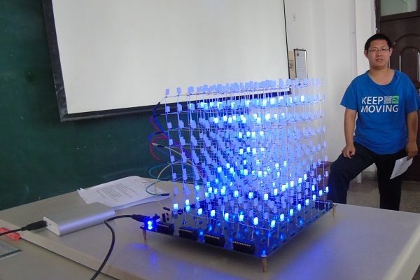 同学们的所有作品中,马飞龙同学小组的作品8阶光立方和李明星同学小组的人体感应智能温控风扇尤为抢眼。8阶光立方是由8*8*8共512个LED组成的三维立方,由单片机、锁存器和六个单独的处理芯片实现对五百个LED灯的亮暗控制。五百多个灯和所有芯片由同学们经过三十多个小时的努力一个个焊接上的,美轮美奂的8阶光立方也是对他们努力的最好见证。人体感应智能温控风扇由人体感应器、温度传感器、单片机、数码显示器、按键和电源构成,能够实现人走风停,根据环境温度自动控制风扇转速的功能。这个作品的主要难度在于电路结构复杂,焊接工作量大,并且对单片机引脚功能掌握得十分深入。