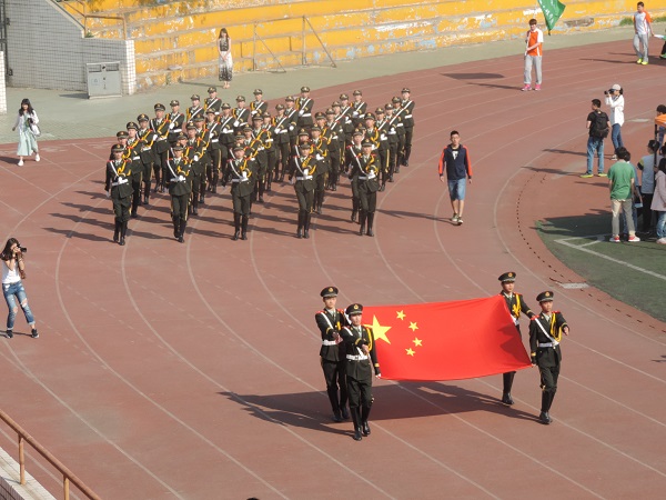随着振奋人心的入场音乐响起,13级14级学生年级专业分为八个方阵,有序入场。升旗仪式结束之后,学院院长宋文龙致开幕词,并宣布运动会正式开始。