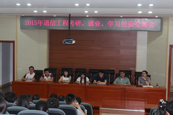 为了进一步激发通信工程专业学生的学习热情,推进毕业生就业质量,6月16日晚18:00,通信工程专业组织召开考研、就业、学习经验交流会。会议请到了2011级通信工程专业具有代表性的五位同学,他们是吕玥(专业排名第一,保送中国科学技术大学研究生)、黄晓(签约华三通信技术有限公司)、伍新华(签约烽火通信科技有限公司)、范三亚(签约上海斐讯数据通信技术有限公司)、李佳佳(考取哈尔滨工程大学研究生)。他们分别从保研学校的选择、简历的设计与面试经验、女生就业的困难与优势、考研复习计划安排与复试等方面为2012级的同学做了详细的介绍,并针对同学们的提出的问题做了耐心的解答。
