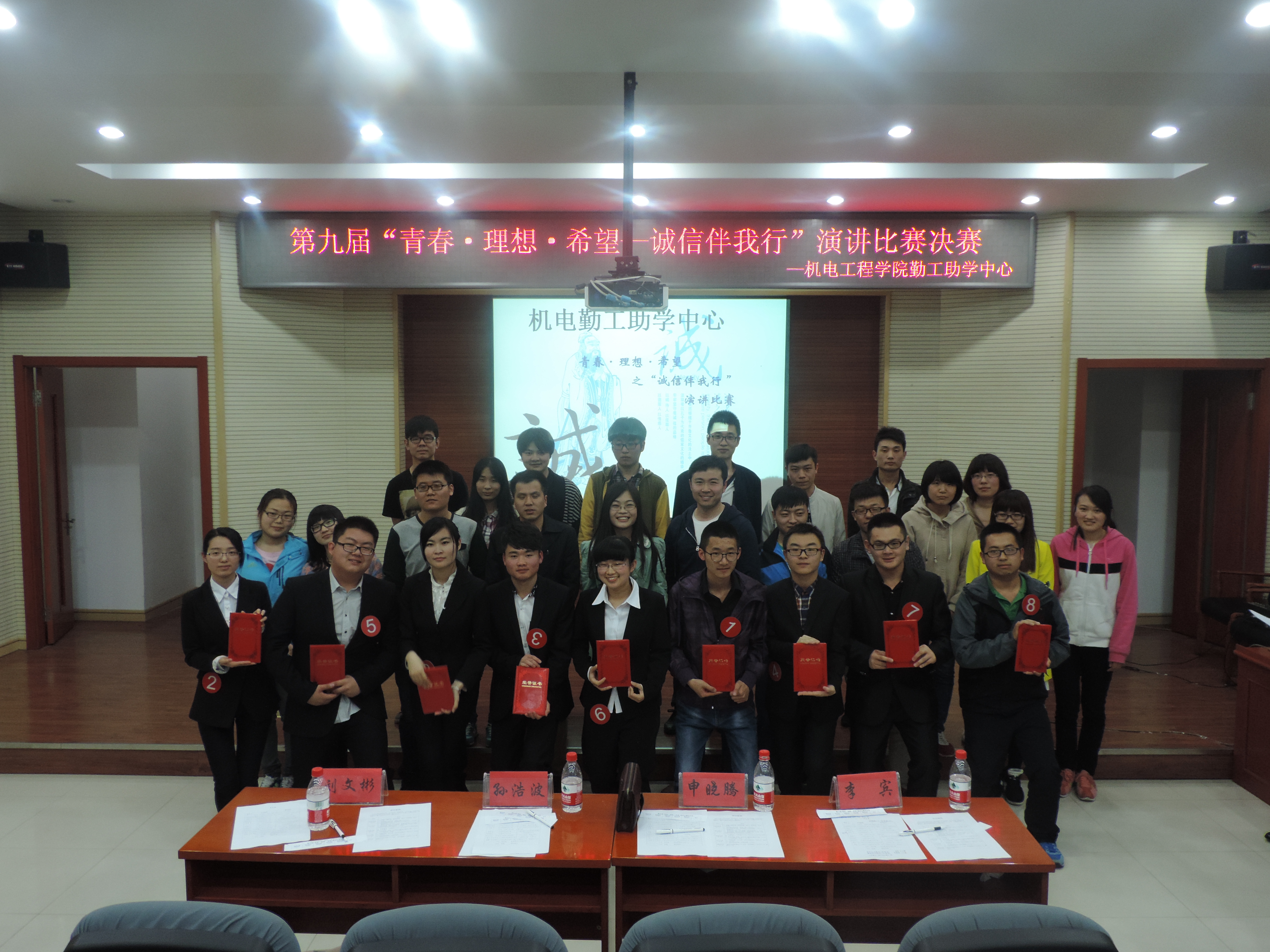 2015年5月19日晚6时,机电工程学院勤工助学中心于主东301成功举办了第九届“青春.理想.希望——诚信伴我行”演讲比赛。出席本次比赛的评委老师有:孙浩波老师、孙晓鹏老师、刘文彬老师。
