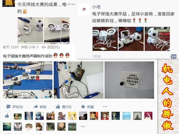 比赛结束后,在网络上看到学生的发的状态“是谁想到焊接大赛焊音箱的……当室友把音箱拿回寝室的时候……我的心都碎了”, “楼道里,此起彼伏的‘欢迎光临’ ……我也是醉了”,在寝室里以及微博、微信等各种社交媒体上学生都不忘晒晒自己的作品,可以想象学生亲手制作的小作品后的荣耀与骄傲。