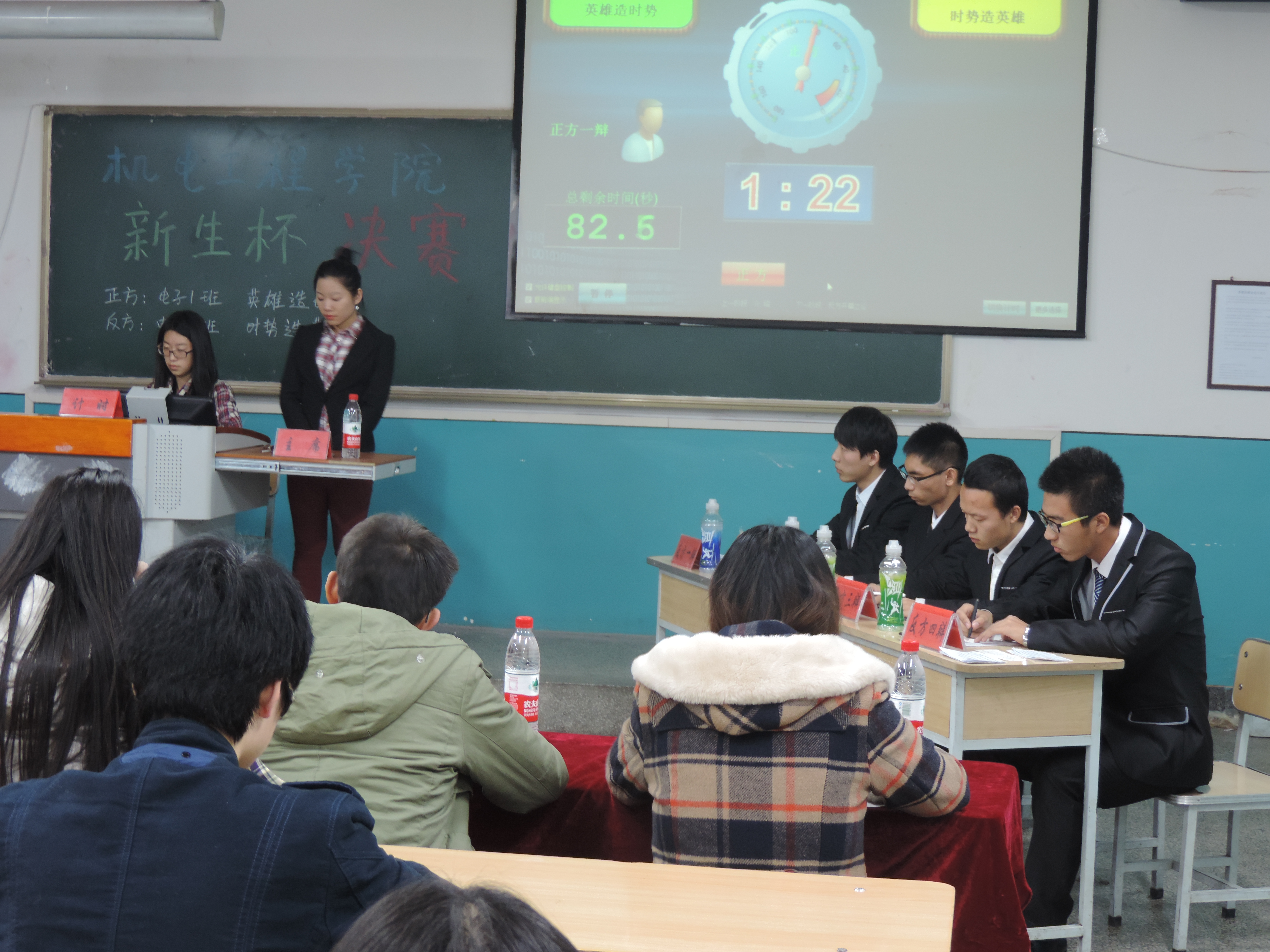 2014年10月30日晚六点,机电工程学院“新生杯”辩论赛决赛在锦绣楼108成功举办。学院非常重视对新生的素质培养,举办这次辩论赛也是对新生的一次考察和考验。机电工程学院2014级辅导员付书朋老师,辩论队队长及各学生组织代表出席了本场辩论赛的评委。此次辩论赛由2012级辩论队队长李蒙主持。