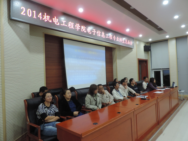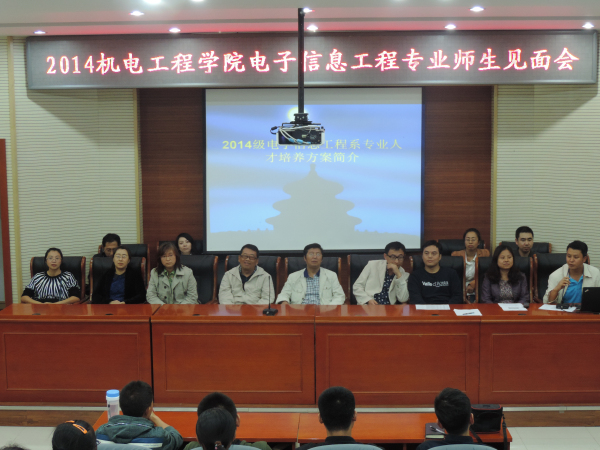 2014年9月18日晚18:00,机电工程学院电子信息工程专业师生见面会于主东301会议室顺利举行。会议由电子信息工程专业支部书记赵永辉主持,机电工程学院电子信息教研室全体教师及2014级电子信息工程专业全体新生参加了此次会议。
