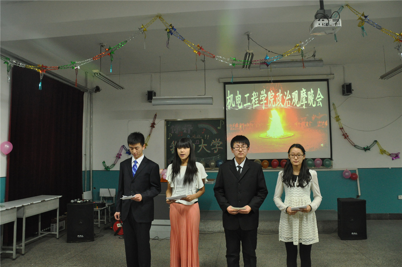 2013年11月17日18时30分,机电工程学院于锦绣楼313教室隆重举办了以“你好,我的大学”为主题的政治观摩活动。郭也、徐小鹏、何思宁、夏挽清等人全程了主持本次活动。出席本次活动的嘉宾有机电工程学院2013级政治辅导员杨林光老师,东北林业大学校指导中心主任潘元琦,机电工程学院综合素质考评中心主任张佳奇,团委副书记孟丹风,学生会副主席胡逸凡,勤工助学中心主任郭福玲,科创中心主任潘云峰,院记者站站长贡小雁以及校指导中心工作人员和十三个学院代表。本次活动由机电工程学院综合素质考评中心主办。