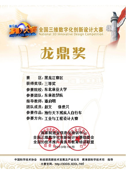 由国家科技部、教育部、中国科协等部门指导,科技部国家制造业信息化培训中心、全国3D技术推广服务与教育培训联盟、中国图学学会、光华设计发展基金会等单位共同主办的“黑龙江赛区2013全国三维数字化创新设计大赛”(3D大赛)落下帷幕。我院学生荣获一等奖1项,三等奖1项。