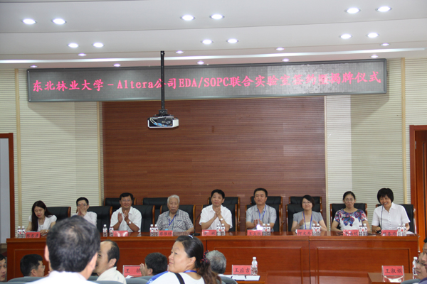 8月10日上午,东北林业大学- Altera联合实验室揭牌仪式在机电工程学院学术报告厅隆重举行。美国Altera公司中国区大学项目经理陈卫中先生、东北林业大学副校长李斌教授、机电工程学院院长宋文龙教授、副院长李树森教授、院党委副书记于洋、全国大学生电子设计竞赛黑龙江赛区专家组组长全国教学名师蔡惟铮教授、哈尔滨工业大学教研处副处长王立欣教授以及来自东北大学、大连理工大学、吉林大学、东北电力大学、哈尔滨工业大学和哈尔滨工程大学等东北地区30余所高校的100余名师生出席了揭牌仪式。