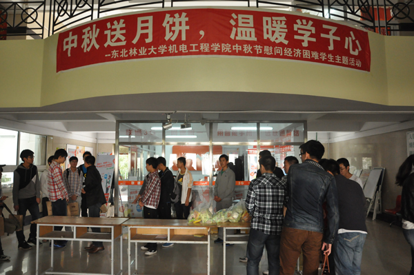 中午12时30分,机电工程学院领导班子和辅导员老师在10B公寓大厅向学院经济困难学生分发了事先精心准备的月饼,并向其致以节日问候和关怀。