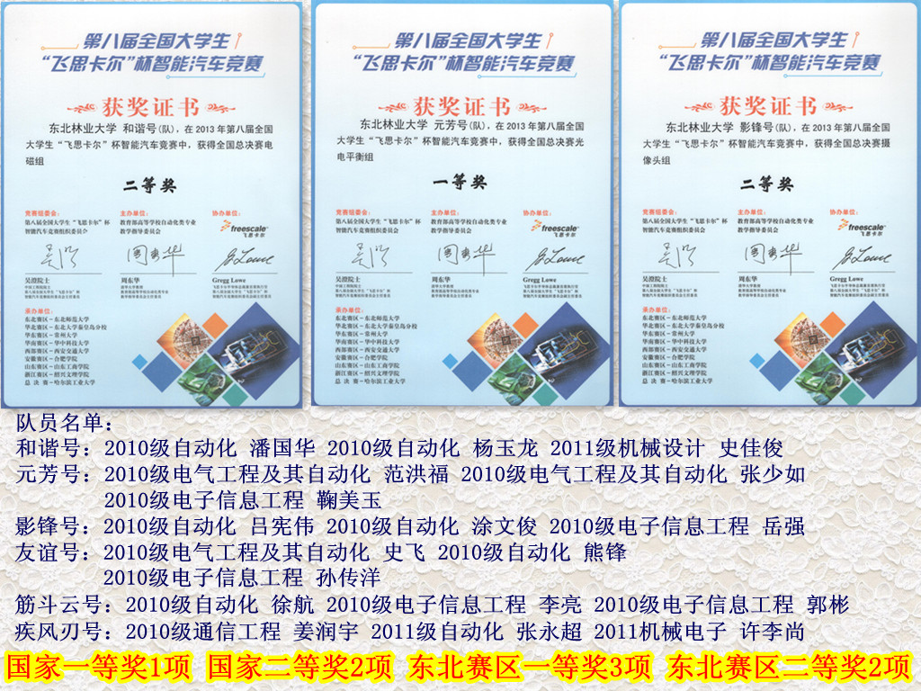 我校代表队自2011年参加全国大学生智能车竞赛以来,充分发扬“团结拼搏 自我激励 发挥优势 争创一流”的东林精神,从2011年的东北赛区二等奖1项、三等奖2项;到2012年的全国二等奖1项、东北赛区一等奖1项,二等奖3项、三等奖2项;再到2013年的全国一等奖1项、全国二等奖2项、东北赛区一等奖3项、二等奖2项,三年三大步成绩快速提升,从初出茅庐的新人跻身全国一流车队行列。