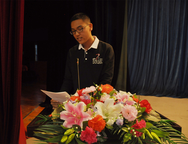 随后,2013级新生代表谢尚奇同学代表广大新生发言。他首先代表全体2013级新生向家长和老师表达了最衷心的感谢。同时,他也代表所有新生郑重表态:在入学之初一定会尽快转换角色,适应大学;在大学四年里,一定会广泛涉猎各种知识,博采众长;努力提高自身素质,不断开拓创新,打造一个充实且圆满的大学生活。