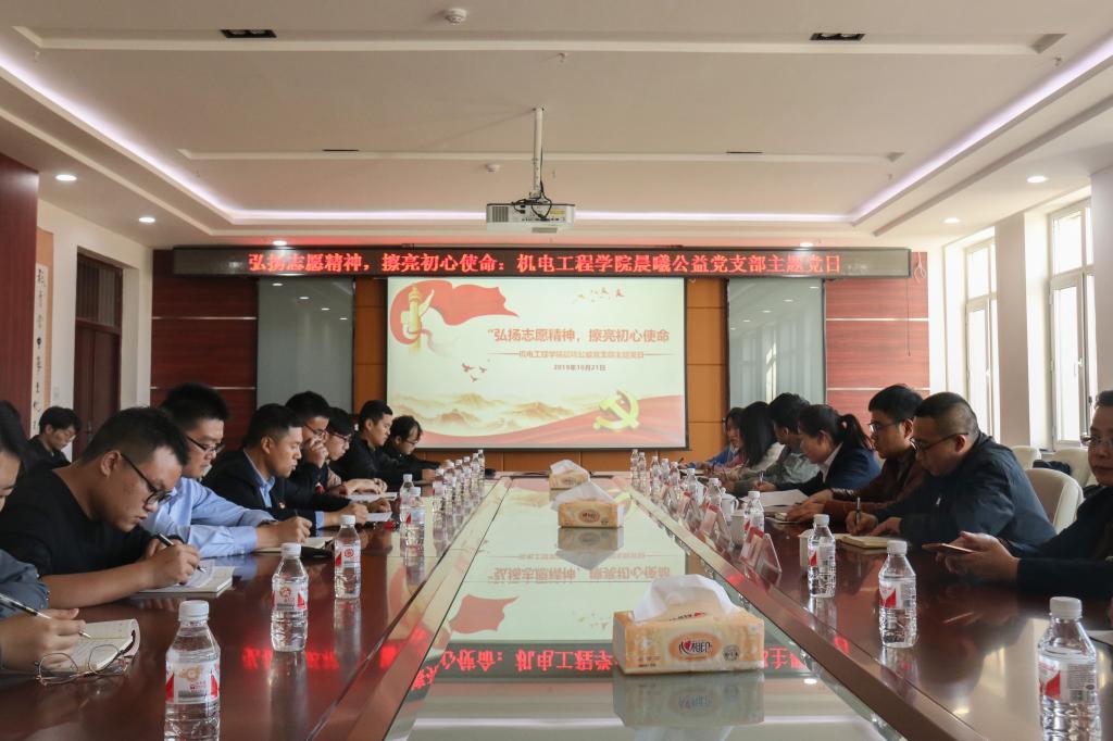 “让志愿服务成为一种更有意义、富有远见的生活方式,用东林人的实际行动打造奋进支部,写好奋进之笔,奏响奋进凯歌。”10月21日下午2时,机电工程学院晨曦公益党支部在成栋楼713会议室,开展了一场别开生面的主题党日活动,支部成员,学院毕业生党员、入党积极分子、志愿者代表共计30余人向全校各基层党支部发出倡议——号召全校师生党员,积极投身党建引领下的志愿服务,更好践行初心使命。教育部“不忘初心、牢记使命”主题教育第五巡回指导组成员梁建莅临现场,全程参与。学校党委组织部副部长于鹏、哈尔滨香坊区文政街道林大社区党委书记兼主任朱艳萍、哈尔滨天赐老人公寓主任张蓓一同参加。活动由机电工程学院党委书记王佳彤主持。