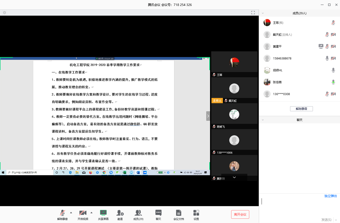 戴天虹向全体教师传达了学校、学院对近期有关工作的要求,重点围绕《机电工程学院2019-2020春季学期教学工作要求》中的11条要求逐条做了详细的解读,通过举实例、谈体会等形式帮助全体教师更加深刻理解文件内涵与工作细节。戴天虹强调,在关键时刻,专业全体教师应该“牢记从教初心,担当育人使命”,耐心解答学生的问题、关心帮扶每一个学生,发挥百折不挠、顽强拼搏的战斗精神,在抗击疫情的战役中携手立德树人,帮助学生构建正确的世界观、人生观、价值观,培养学生坚韧不拔、从容不迫、爱国爱民的奋斗精神和家国情怀,引导学生延期开学不停学,克服各种不利因素,利用网络积极投入学习,锤炼知识与本领报效祖国和人民。