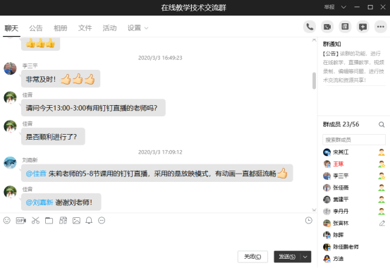 运行中:监督+提醒。学院聘请经验丰富的教师组成“在线教学指导委员会”,同时从课程测试阶段开始,就将领导班子成员全部编排进入相应课堂,实现“听课关口前移,评课监督前移”,提前发现、解决在线教学过程中存在的各类问题,优化在线教学质量。正式开课后,教指委成员继续随堂听课,随时提醒、帮助教师改进教学方式,总结教学经验,充分发挥精准指导和督促落实作用。经过一个月的在线听课,教指委成员对广大教师的一系列高质量“规定动作”和“自选动作”表示赞赏,一致认为老师们课前能够认真备课,做好预习测验,耐心解答学生问题;课上讲解知识点细致到位,注重启发学生;课后坚持跟踪问效,通过布置讨论题或作业,鼓励学生提出更多问题,而且应用在线课程平台日益熟练,授课效果渐入佳境,能够保质保量完成教学任务。