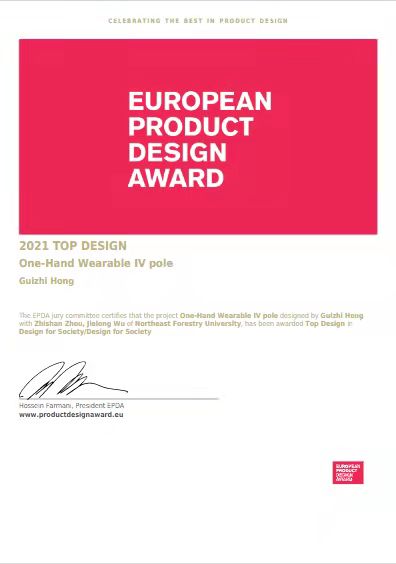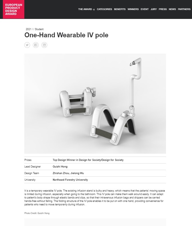 日前,2021年度欧洲产品设计奖(European Product Design Award™)新鲜出炉,由我院工业设计专业2018级本科生洪贵芝、周稚珊团队设计的“One-Hand Wearable IV pole(单手可穿戴输液架)”荣获学生类作品“最佳设计奖”暨铂金奖(TOP DESIGN WINNER)。东北赛区铂金奖共2项,其中黑龙江1项(东北林业大学)。