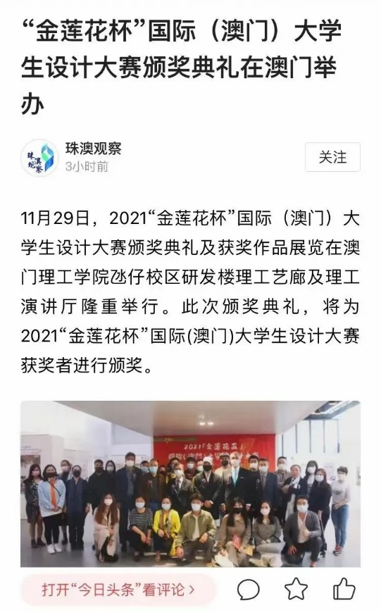 「金莲花杯」国际(澳门)大学生设计大赛自2014年起,在澳门特区政府相关主管部门的大力支持下每年举办一次,自2019年起改为每两年举办一次,至今已经成功举办五届,得到业内各界的高度支持与认可。此次大学生设计大赛,共收到来自中国内地及港澳台、新加坡、印度尼西亚、韩国、意大利、澳大利亚等国家和地区各大院校的参赛作品1000多份,学生分布院校近200所。赛事评委分别来自中国澳门、中国香港、中国内地、中国台湾及新加坡等国家(地区),包含业界贤达、高校教授讲师、专业设计师等。赛事受到中国新闻网、人民资讯、新浪新闻中心、华夏经纬网、深圳新闻网、珠澳观察、大湾区观察等多家主流媒体报导。