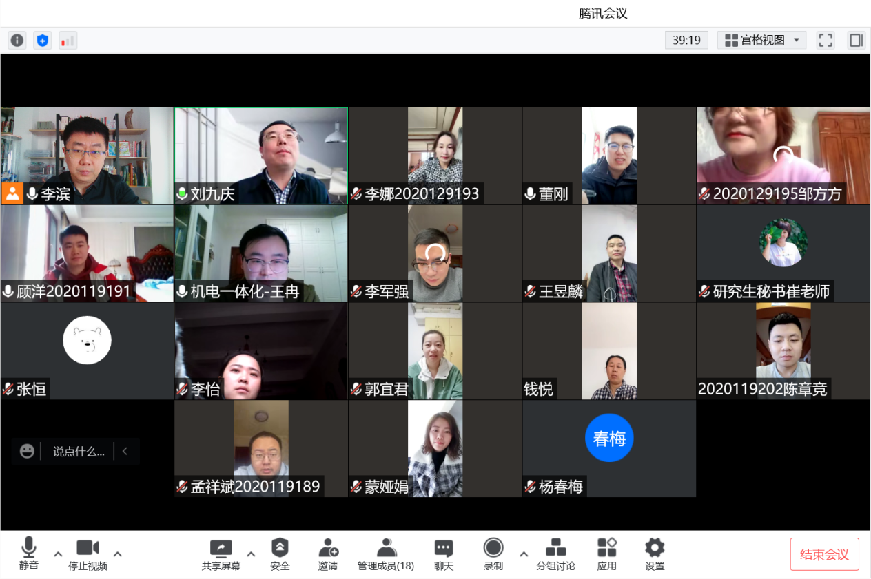 与会同学逐一汇报了当前的学习进度,并通过与全日制学生的纵向对比和班内同学的横向对比,更加明晰了自己的定位。大家表示,一定会勤与导师沟通,按时间节点完成培养目标,多出研究成果,取得实质进步,力争在学制里顺利毕业,不负学院和导师的期望。