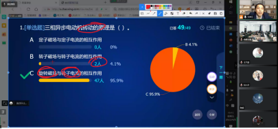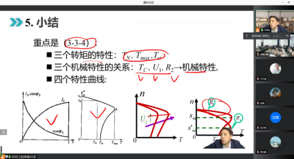 本次课程采用“腾讯会议+学习通”的形式进行在线直播,内容是《三相异步电动机的概述》。宋其江老师通过学习通教学平台发布测验,了解学生对前期知识的掌握程度,更好地实现知识的强化矫正。以启发式教学方式引出主要教学内容,深入浅出构建知识体系,加强学生对课程内容的认识和理解,通过生活实例、动画等更为直观易懂的教学手段对重难点知识深入讲解,并巧妙地将思政元素融入专业课堂,充分调动学生积极性。发布课堂练习,以练代讲,直播投屏批改练习,开展师生研讨与教师讲评,引导学生独立思考,促进知识内化,有效提高了学生的参与度,检验了学习成效。最后,宋老师以思维导图形式进行课程小结,总结方法,整合反思,并布置课后作业,加强巩固,拓展知识。整节课实现了课前测验-课程导入-强化目标-参与式活动-课堂小结-课后作业-布置任务的教学闭环,多元化的教学手段和形式、线上线下相融合的教学方法,理论知识与仿真实验的结合,将学生吸引在课堂,提升了教学效果,培养了学生的自学能力和独立思考的能力。