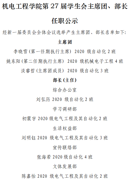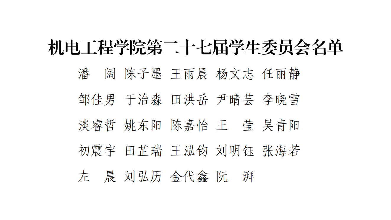 经投票,李晓雪、淡睿哲、姚东阳3名同学当选为新一届学生会主席团成员;潘阔、王雨晨、李晓雪等24名同学当选机电工程学院第二十七届学生委员会委员。