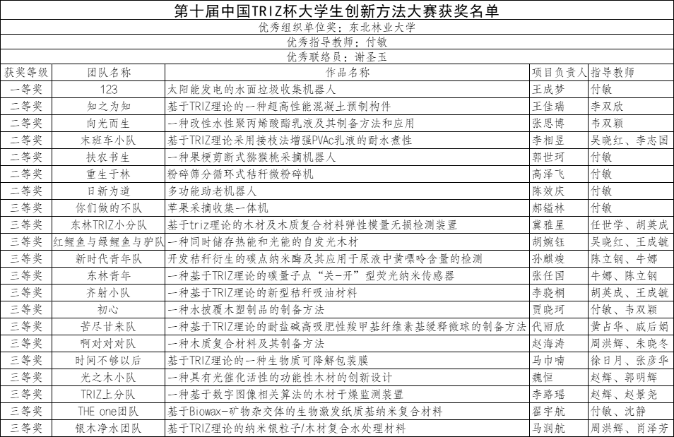 日前,由中国科学技术协会、科学技术部联合主办的第十届中国TRIZ杯大学生创新方法大赛决赛在哈尔滨工程大学落下帷幕,我校21件作品从296所高校的2145项参赛作品中脱颖而出,获得一等奖1项、二等奖6项、三等奖14项,学校获得优秀组织奖。