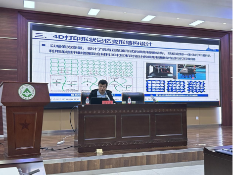 之后,刘立武教授以“形状记忆智能复合材料可变形结构设计及验证应用”为主题进行报告。刘立武教授首先介绍了哈尔滨工业大学力学学科发展的基本情况和研究方向,重点介绍了航空航天研究对我国的战略意义。在随后的报告中,刘立武教授以形状记忆聚合物这一典型智能材料为切入点,围绕“形状记忆空间展开结构设计”和“4D打印形状记忆变形结构设计”两个方面进行详细报告。刘立武教授强调,空间展开机构的执行过程主要为锁定释放—驱动展开—机构缩进,4D打印形状记忆变形结构的核心技术是响应快、韧性高的形状记忆聚合物材料。最后,刘立武教授报告了自组装、蜂窝、曲形格栅、力学像素几何等一系列形状记忆聚合物基4D打印结构。