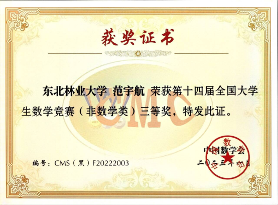范宇航,东北林业大学机电工程学院机器人工程专业2021级本科生,汉族,中共党员。成绩优异,综合发展。曾获国家奖学金、国家励志奖学金;“黑龙江省三好学生”、“三好学生标兵”、“优秀共青团干部”、“优秀共青团员”等称号;全国大学生智能汽车竞赛国家级一等奖、国家级二等奖、全国大学生机器人大赛Robomaster机甲大师联盟赛冠军、全国赛三等奖、全国大学生数学建模竞赛省级二等奖等;在学习之余积极投身志愿服务,累计工时180余小时;
