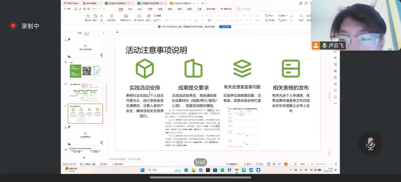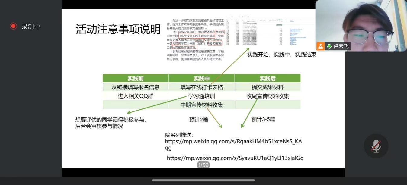 闫浩杰则围绕本次寒假社会实践中的六大安全问题 —— 护林实践安全、社区服务安全、政务实习安全、返乡宣传安全、企业实习安全和劳动实习安全,从个人、学院、学校三个层面逐一讲解了相应的安全应对措施。