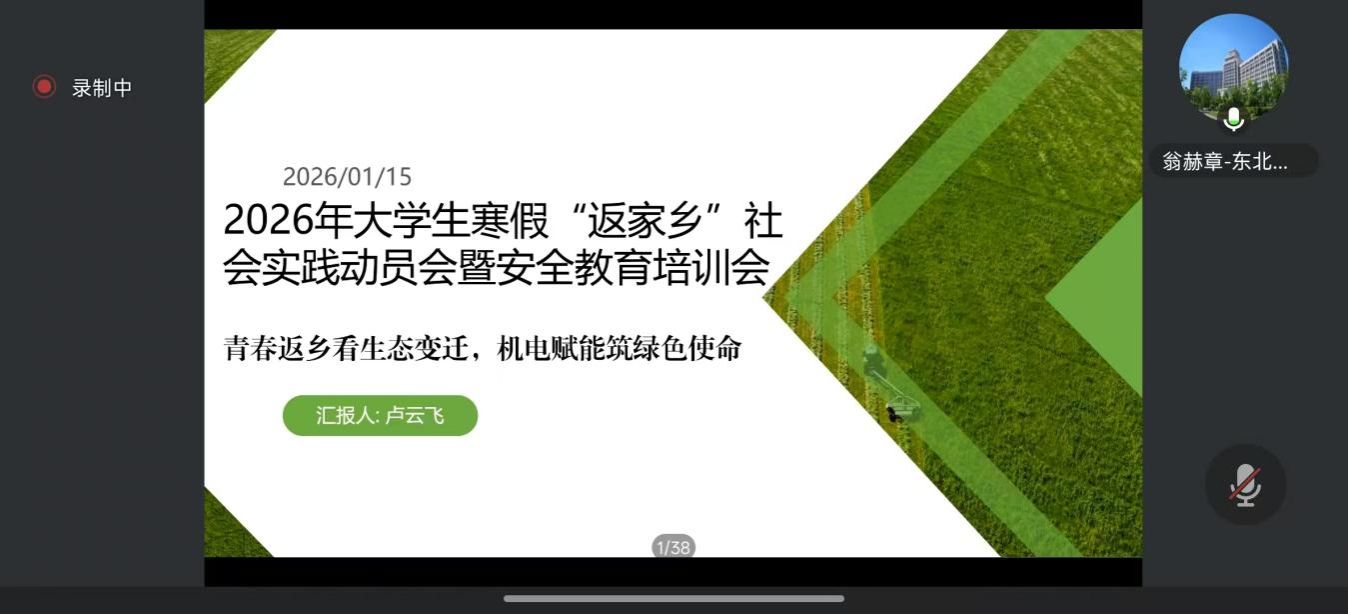 为深入学习宣传习近平新时代中国特色社会主义思想,全面贯彻落实党的二十大和二十届四中全会精神,引领广大学子争做有理想、敢担当、能吃苦、肯奋斗的新时代好青年,近日,学院团委于线上召开以“青春返乡看生态变迁,机电赋能筑绿色使命”为主题的寒假“返家乡”社会实践动员大会暨安全教育培训会。会议由学院团委老师、学生干部主持,参与寒假社会实践的全体学生参加。