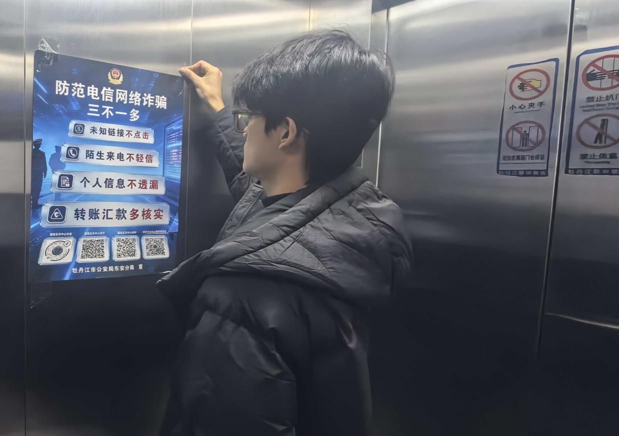 (孙炜寒在电梯里粘贴反诈有关知识的海报)
