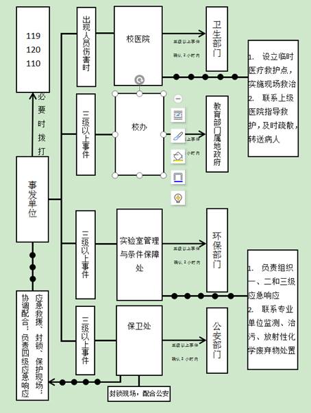 出现人员伤害时,需同时报告校医院,请求支援。特别紧急的情况可先越级报告,或根据人员受伤、火警等情况分别拨打 120 急救电话、119 火警电话。应急处置流程详见附件 1。